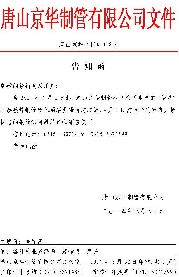 告知函 唐山京华字【2014】8号