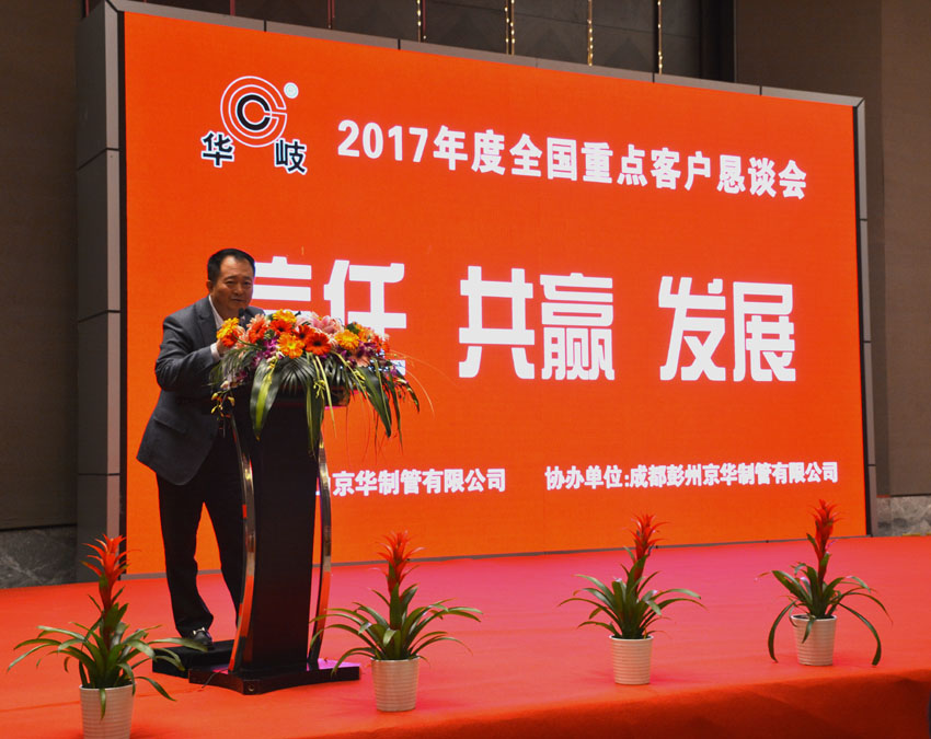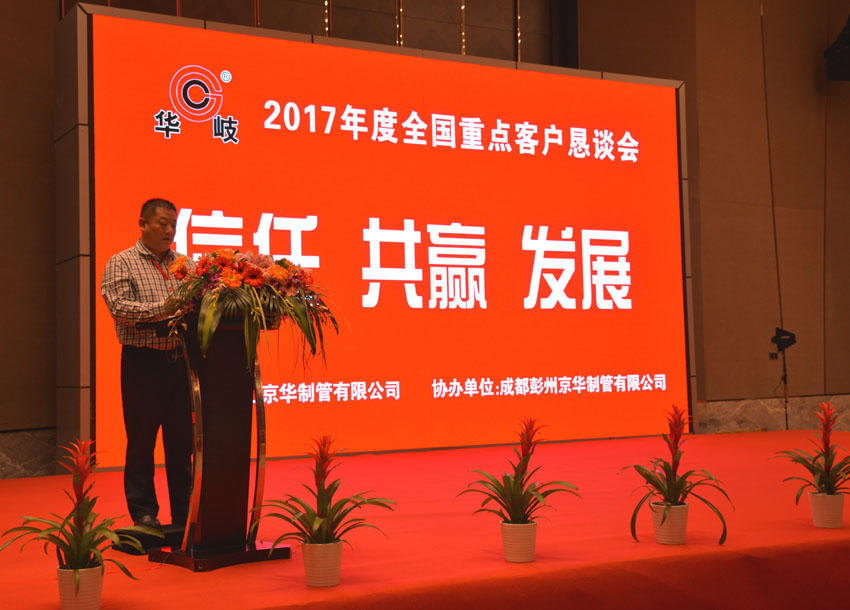 成都彭州京华总经理包振升代致以热情洋溢的欢迎词。包总指出,唐山京华在温朝江总经理的领导下,公司整体经营工作取得了骄人的业绩,给集团树立了典范。彭州京华在西南市场也是规模最大的焊管生产基地,华岐品牌集团共享,在市场上享有良好的声誉,希望广大客户朋友继续支持华岐品牌,希望参会客户成都之行身心愉快并祝愿大会取得圆满成功。